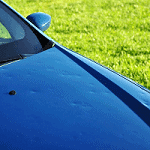 Place the dry ice on the inside of the dent, if possible, using heavy gloves. If unable to get to the inside concave part of the dent, hold the dry ice so a corner can fit into the bottom lowest part of the cratered dent. Keep pressing the dry ice until the metal is frosted at least 2 inches beyond the dent. Let the metal warm-up (in the sun is the best) and repeat the procedure. Sometimes the dent will pop out perfectly. Otherwise, it will reduce the dent noticeably. Creased metal will still show the crease line, but the dent will be less pronounced. I have not seen any paint damage, but it could peel if it is broken.